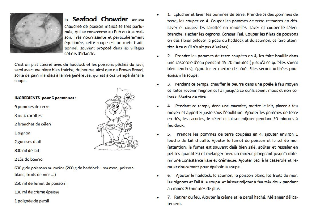 Lors de la Saint Patrick, nous nous sommes régalés avec une recette de chaudrée de poissons. Notre irlandaise cuisinière, Mauchamp Anne, vous livre sa Seeafood Chowder recette ci-dessous. N’hésitez pas à nous envoyer des photos de vos culinaires réalisations!