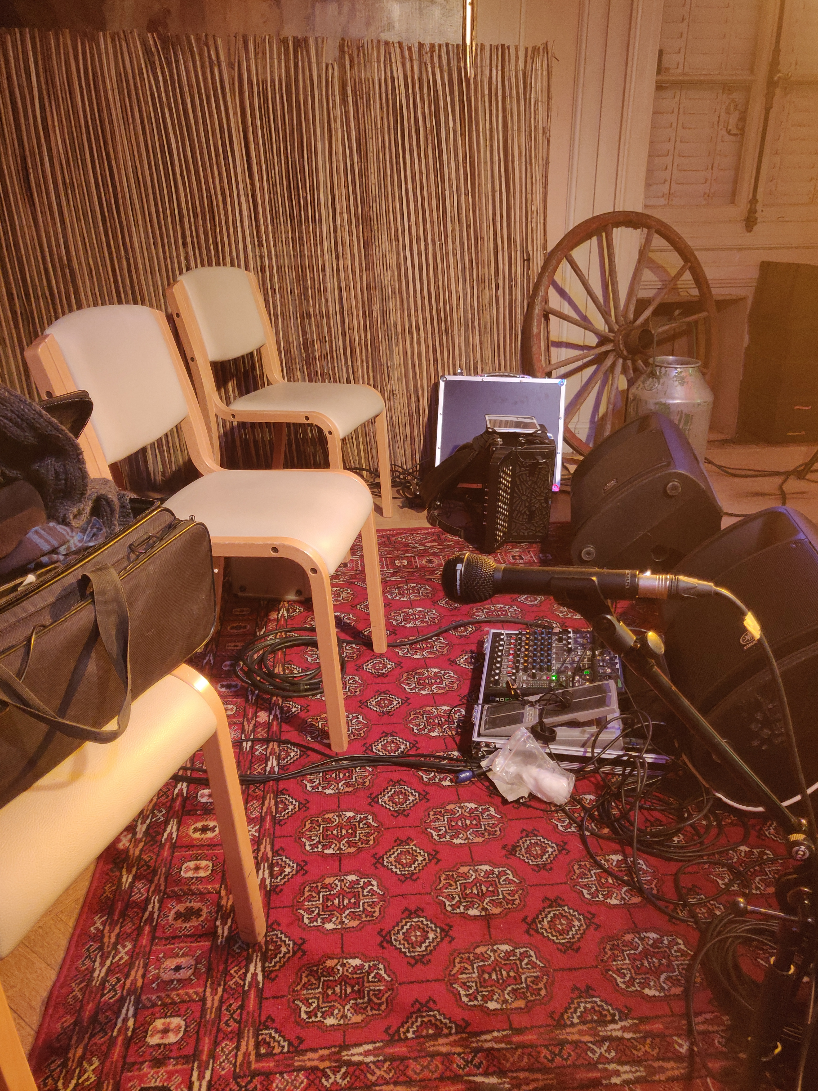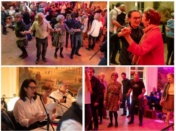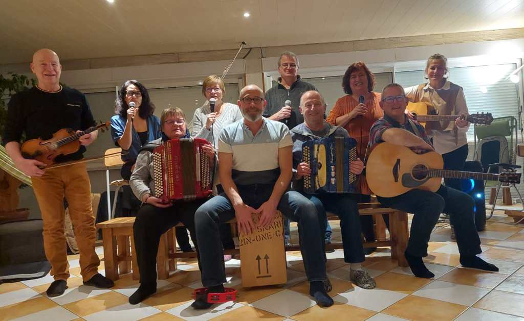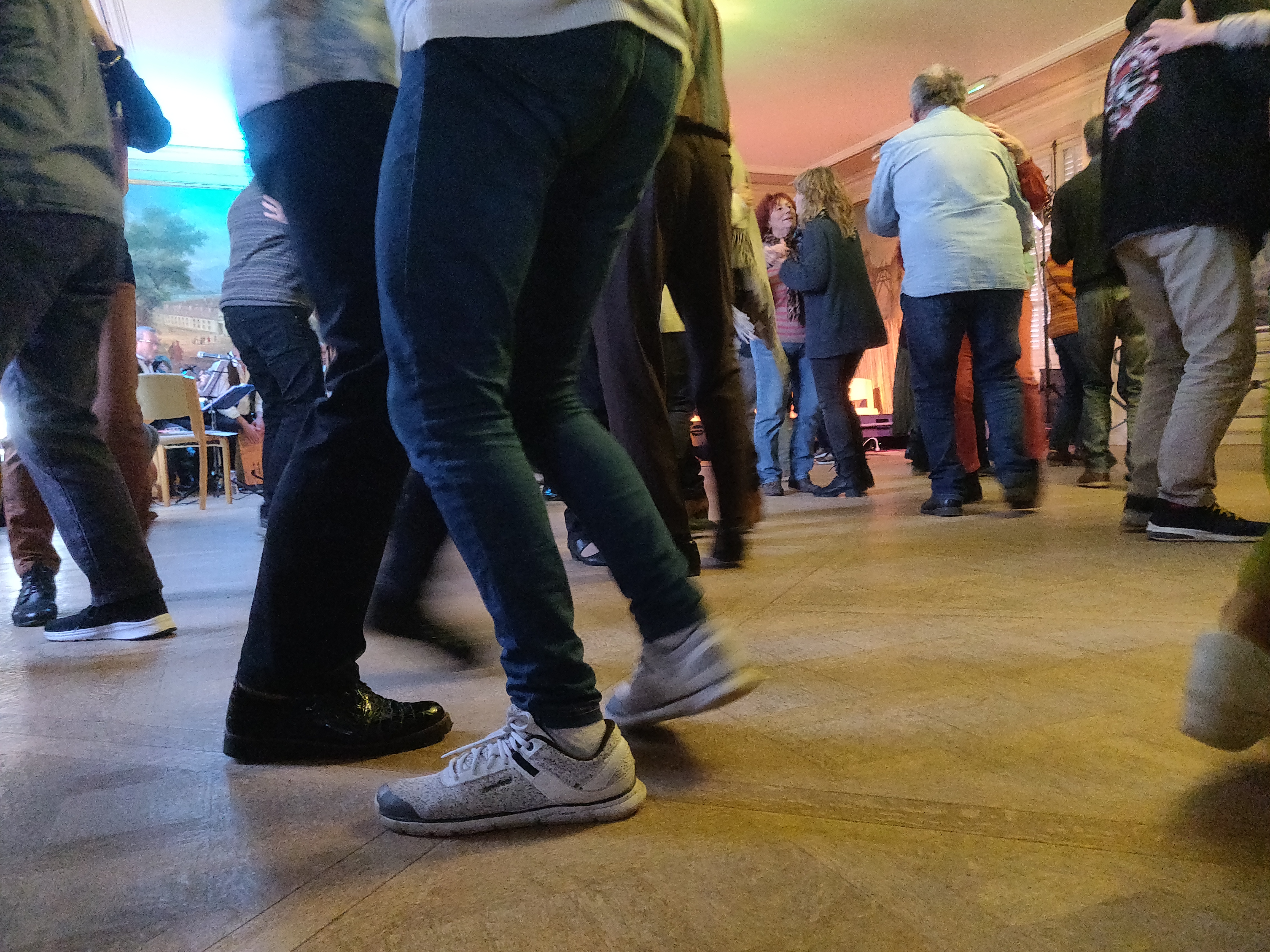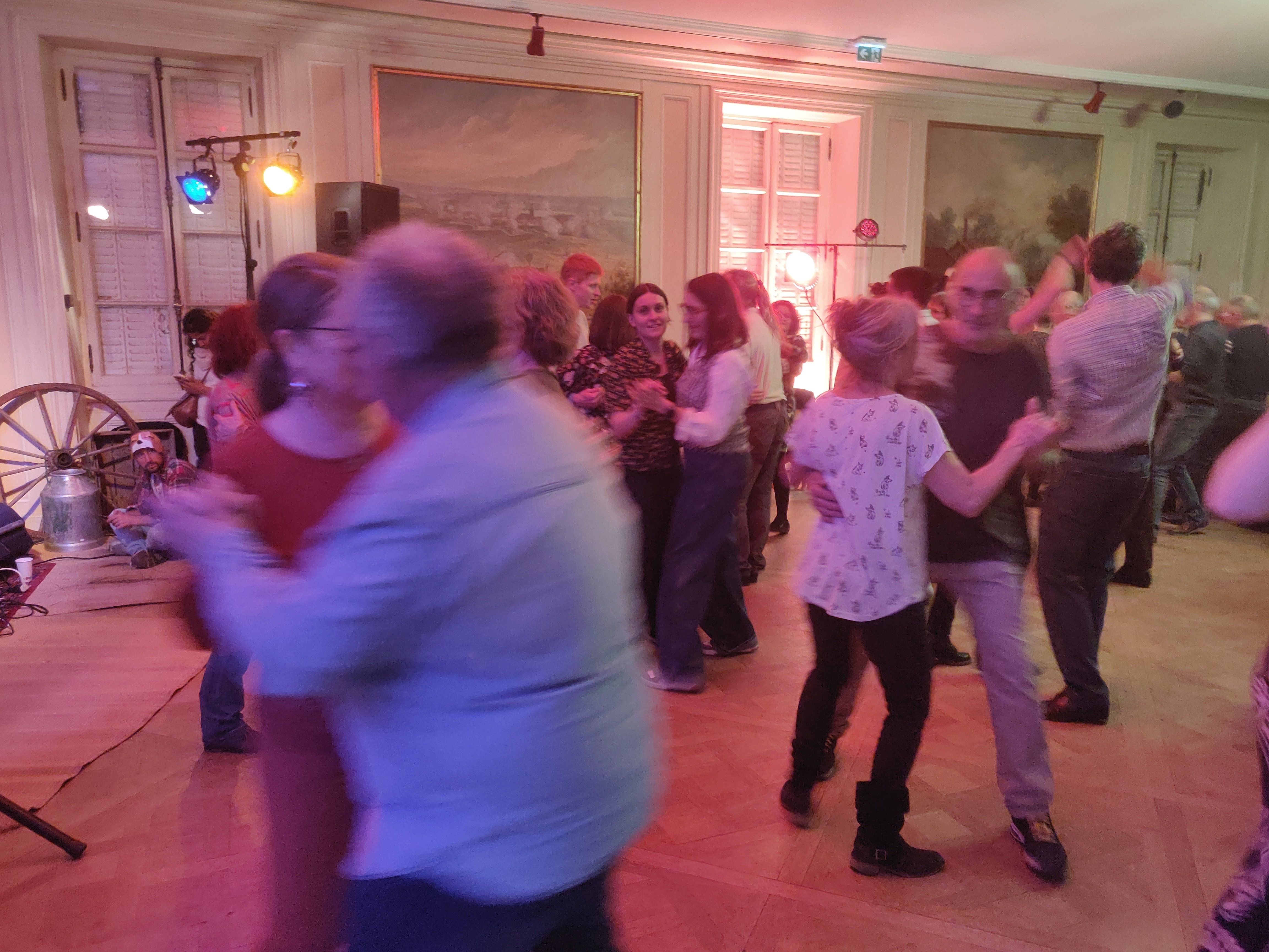 Début de soirée avec initiation aux danses trad, animée par les musiciens de Trad bazar avec adèle et Nathalie aux manettes, ça dépotte!