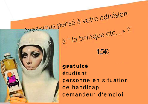Adhérer à notre association, c’est lui assurer de vivre de façon autonome, permettre une programmation riche avec un coût peu élevé pour la participation aux événements, c’est faire vivre notre WEB TV coopérative, mais c’est aussi l’occasion de participer aux ateliers, à la programmation, et pourquoi pas ? Si vous le désirez, participer autrement qu’en spectateur-consommateur aux événements de ‘la baraque etc… «
